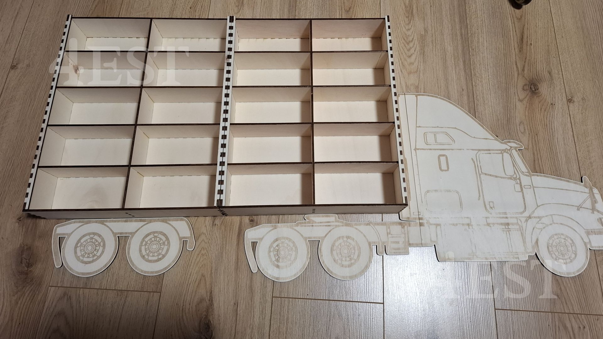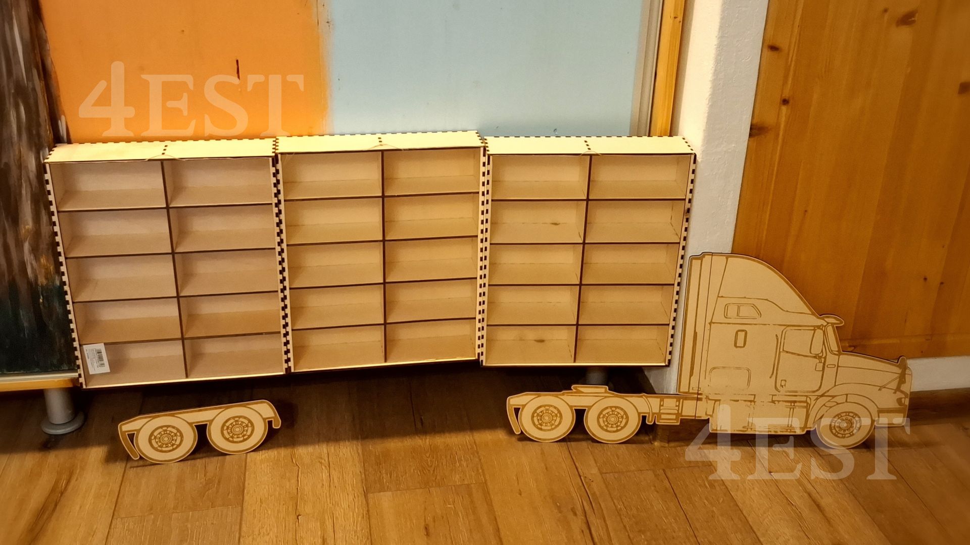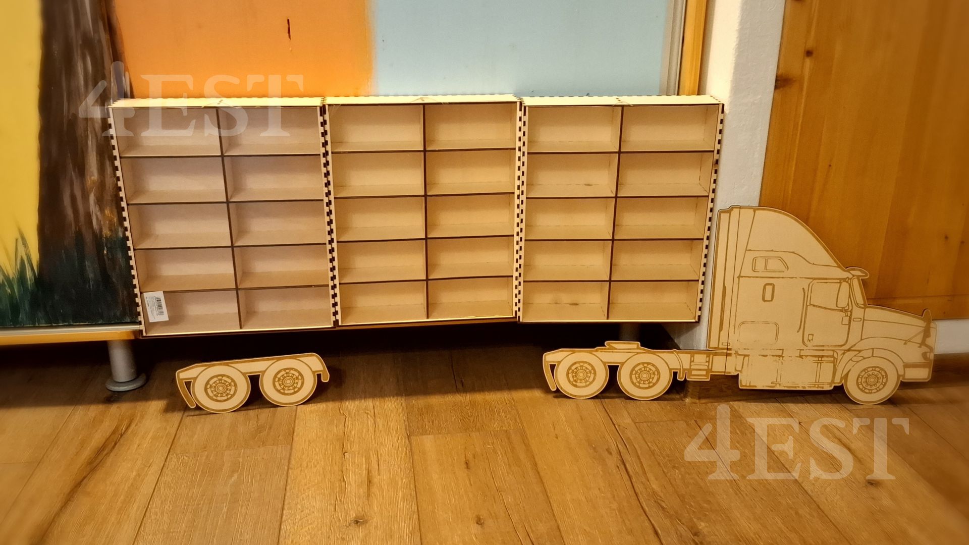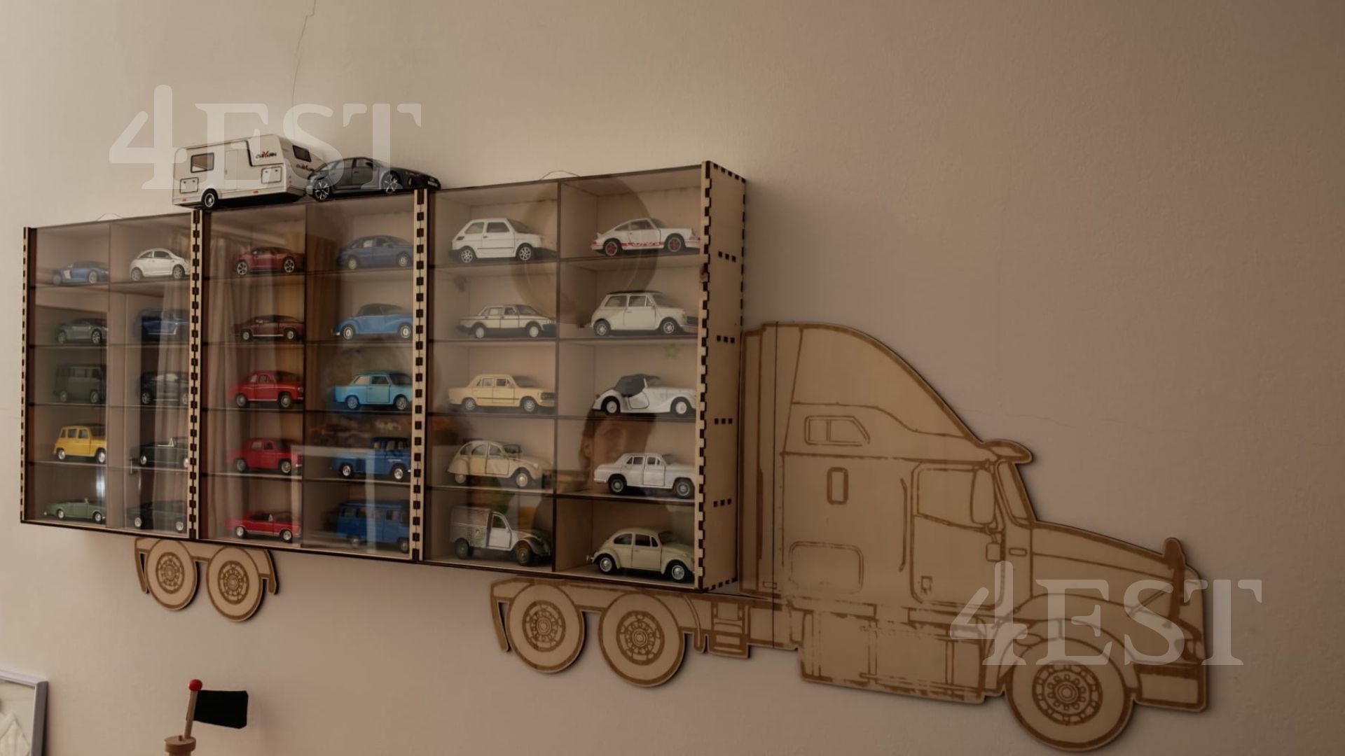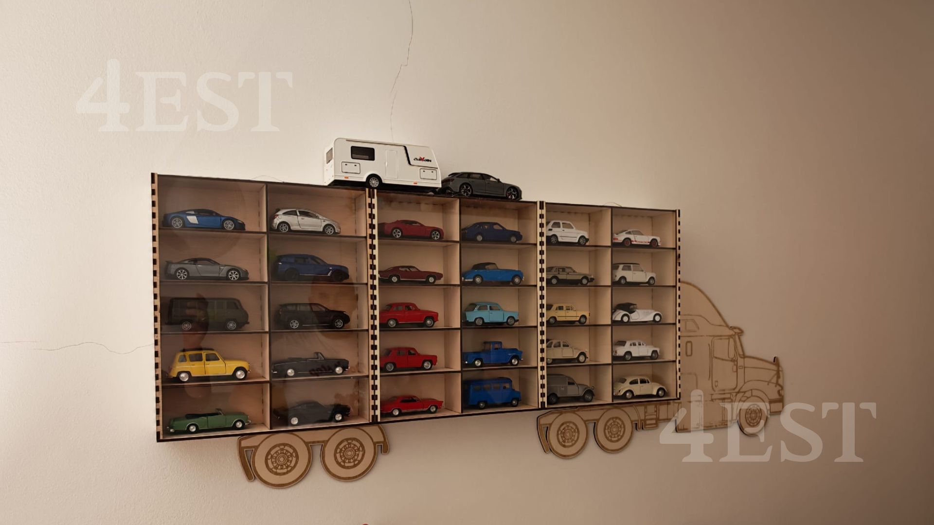 The truck-shaped shelf features multiple compartments, providing ample space for storing and displaying diecast cars, model vehicles, or other collectibles. The detailed laser-engraved truck design adds an extra touch of uniqueness, making it a stunning wall-mounted display.